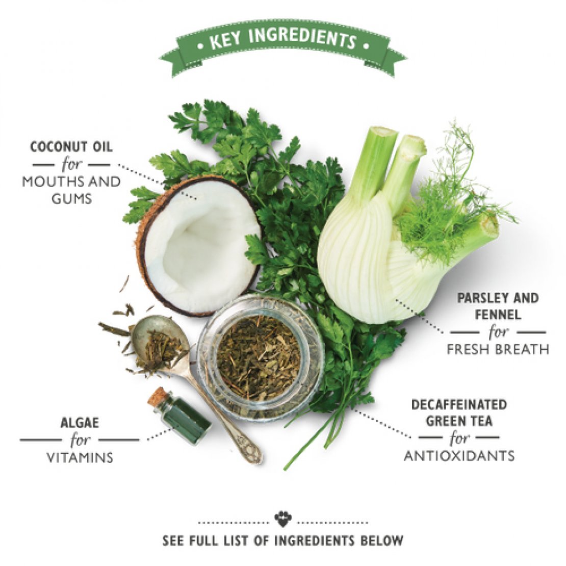 We believe all pets deserve proper food, and that’s still true when it comes to dental chews. Because dogs eat their ‘toothbrush and toothpaste’ (their dental chew), it’s important that their chew is as kind to their tummy as it is to their teeth. Woofbrush has been carefully crafted with help from our pet dental expert to make sure it works brilliantly, and uses top notch natural ingredients like parsley, coconut oil and fennel for a proper clean without the added nonsense.